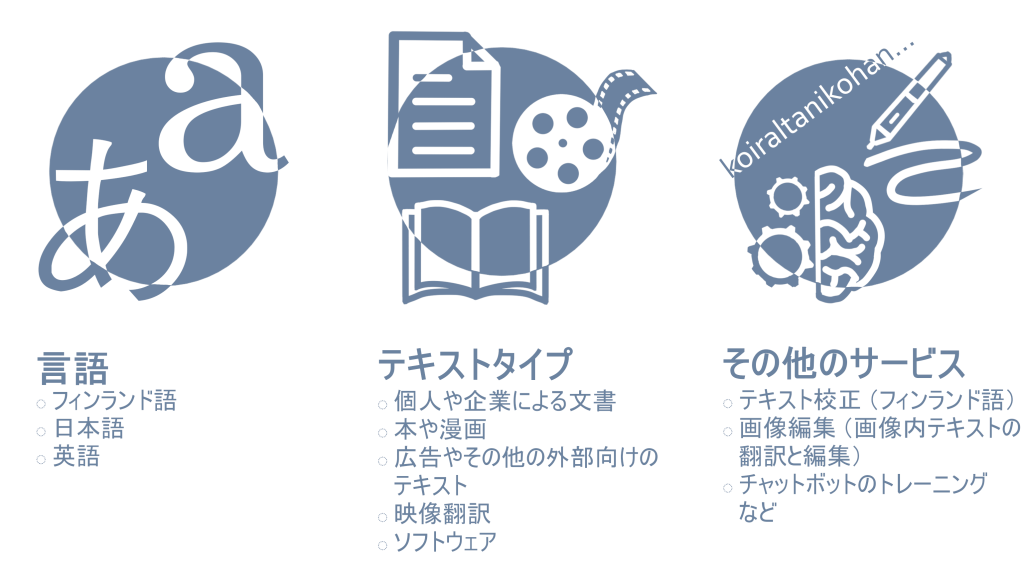 2022年より、フィンランド語・日本語・英語間の言語サービスを提供しております。ヘルシンキ大学にて日本語・日本文化を専攻するとともに、ソフトウェアローカリゼーションを学びました。これまで主に、医療機器や車載ソフトウェアなどの技術分野におけるユーザーマニュアルおよび各種ドキュメントの翻訳を中心に、社内利用向けおよびエンドユーザー向けに公開されるパンフレット、ウェブサイトなど、幅広い分野の翻訳を手がけてまいりました。